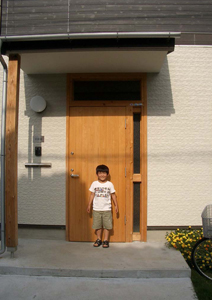 玄関ドアーは桧の無垢材で製作しました。玄関には明かり窓を付けています。ガラスは防犯のフイルム張り