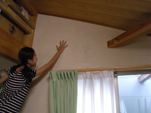 竣工時に左官壁に残した子供さんの手形は、壁から切り抜いて保存。